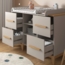 Die Vitalispa Wickelkommode Cashmere-Eiche bietet mit ihren großzügigen Abmessungen von 133 x 98 x 70 cm (BxHxT) und vier Schubladen optimalen Stauraum für die Wickelzeit und darüber hinaus. Die pflegeleichte Oberfläche aus Melaminharzbeschichtung sorgt für hygienische Bedingungen. Die abnehmbare Wickelauflage (111 x 10 x 70 cm) ermöglicht eine vielseitige Nutzung. Die Montage ist schnell und unkompliziert, sodass Sie im Handumdrehen von den praktischen Eigenschaften profitieren können.