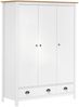 Der vidaXL Kleiderschrank mit 3 Türen Hill in Weiß ist eine stilvolle und praktische Lösung für Ihre Aufbewahrungsbedürfnisse. Hergestellt aus robustem Kiefernholz, bietet er viel Stauraum mit 2 Schubladen, 5 Regalfächern und einem großen Fach mit Kleiderstange. Die Abmessungen betragen 127 x 50 x 170 cm (B x T x H). Der Schrank ist einfach zu montieren und lässt sich leicht reinigen.