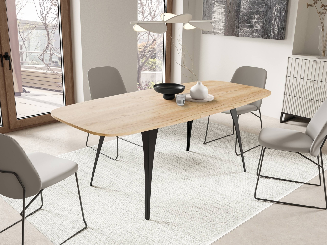 Esstisch Adzaw 160 ist ein eleganter, ausziehbarer Tisch mit einer Länge von 160 cm, der auf 198 cm erweitert werden kann. Die Tischplatte aus 18 mm Laminat und der ABS-Rand sorgen für Langlebigkeit. Die stabilen Beine aus schwarz pulverbeschichtetem Stahl bieten eine moderne Note. Mit einer Breite von 90 cm und einer Höhe von 76 cm ist dieser Tisch ideal für gesellige Runden.