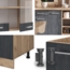 Die Vicco Komplettküche in Schwarz Beton und Goldkraft Eiche bietet Ihnen eine moderne und funktionale Küchenzeile mit einer Breite von 240 cm. Die Arbeitsplatte aus Goldkraft Eiche hat eine Stärke von 2,8 cm und eine Tiefe von 60 cm. Die Küche besteht aus robusten Spanplatten mit einer Melaminharzbeschichtung und ist ideal für jeden Kochbereich.