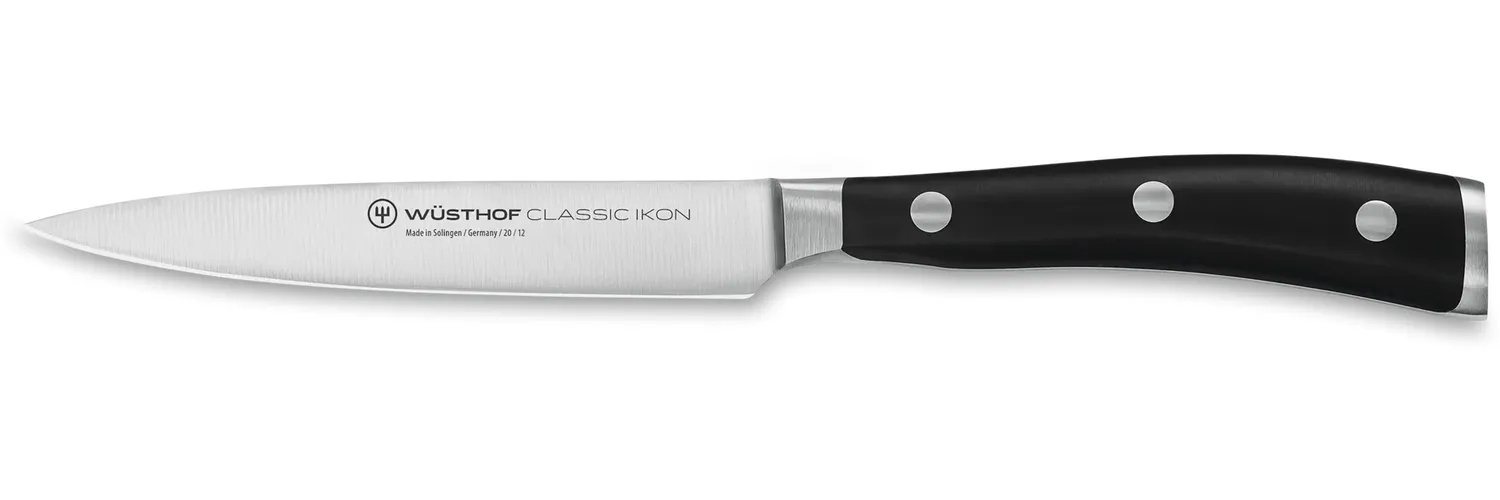 Das Wüsthof Dreizack Classic Ikon Gemüsemesser mit einer Klingenlänge von 12 cm ist ein unverzichtbares Küchenwerkzeug. Die schlanke, mittelspitze Klinge eignet sich hervorragend zum Schneiden von Zwiebeln, Kräutern und Gemüse. Der Griff aus hochwertigem Spezialkunststoff sorgt für einen sicheren Halt und liegt angenehm in der Hand. Die aus einem Stück geschmiedete Klinge aus Edelstahl (Chrom-Molybdän-Vanadium-Stahl) garantiert hohe Härte und Schnitthaltigkeit.