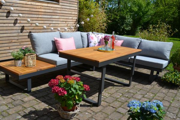 Ecklounge Santorini ACACIA Wood - Tisch höhenverstellbar - Polster hell / mittelgrau