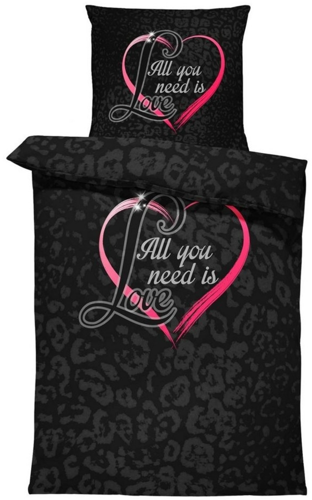 Die One Home Bettwäsche mit Leopardenfell-Optik und dem Schriftzug "All you need is Love" ist eine moderne und stilvolle Wahl für Jugendliche und Erwachsene. Hergestellt aus 100 % Mikrofaser (Polyester) bietet sie ein optimales Schlafklima, bewahrt Ihre Körpertemperatur und transportiert fünfmal mehr Feuchtigkeit nach außen als Baumwolle. Die Bettwäsche ist ganzjährig einsetzbar und pflegeleicht.
