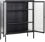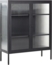 Moderne Vitrine LERRYN aus schwarzem Stahl mit geriffeltem Glas. Diese stilvolle Glasvitrine bietet Stabilität und Langlebigkeit durch ihre mattschwarze, pulverbeschichtete Oberfläche. Mit den Maßen 90 x 35 x 111 cm und einer maximalen Belastung von 20 kg ist sie ideal für die Präsentation Ihrer Lieblingsstücke. Ausgestattet mit 2 Türen und 3 höhenverstellbaren Einlegeböden, sorgt sie für Flexibilität und Ordnung. Verstellbare Sockelfüße garantieren Standsicherheit.