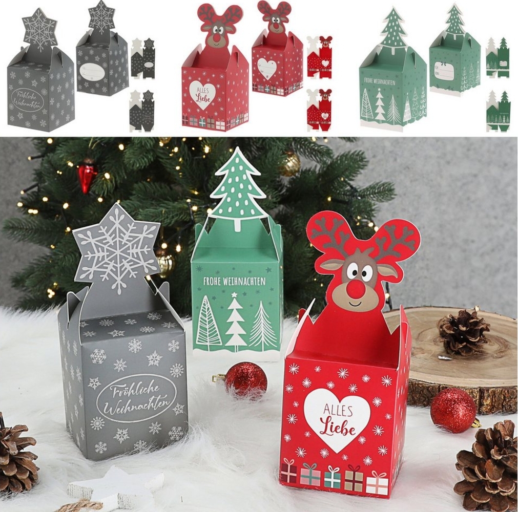 Mit dem CEPEWA Geschenkbox Süßigkeitenbox 3er Set in weihnachtlichen Motiven verpacken Sie selbstgebackene Kekse, Süßigkeiten oder Pralinen stilvoll. Die Boxen aus Papier in den Farben Rot, Grau und Grün sind leicht zusammenzufalten und wiederverwendbar. Mit einem Maß von 8,5 x 10 x 8,5 cm bieten sie ausreichend Platz für Ihre Geschenke und Dekoartikel.