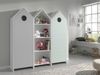 Der Kinderschrank besteht aus einem Regalschrank und 2 Schränken mit einer Tür, die Schränke sind in der Anordnung frei kombinierbar. Im Lieferumfang sind zudem drei Einlegeböden und eine Kleiderstange enthalten. Der Korpus ist aus hochwertigem MDF Holzwerkstoff und in der Farbe Weiß lackiert. Die Fronten, ebenfalls aus MDF, sind in Mint und Grau lackiert, mit waagerecht verlaufenden Rillenprofilen. Die Rückwand ist in Weiß Dekor beschichtet.
