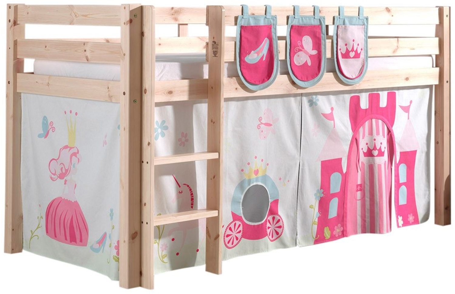 Lieferumfang: Hochbett mit Textilset "Princes" - Allgemeine Eigenschaften: - Material: Massive Kiefer - Oberfläche: Natur - Besonderheiten: Umlaufender Absturzschutz, hochwertige Verarbeitung, gute Stabilität - Beschläge: Metall - Montage: Zerlegt, mit Aufbauanleitung zur einfachen Selbstmontage - Spezifische Details: - Liegefläche: 90 x 200 cm - Pfostenstärke: Ca. 6,4 x 6,4 cm - Höhe Boden bis Unterkante Bettseite: Ca. 70 cm - Höhe Oberkante Bettseite bis Oberkante Absturzschutz: Ca. 36 cm - Leiter: Links oder rechts montierbar, mit breiten Trittstufen - Rolllattenrost: Im Lieferumfang enthalten - Textilset: Design "Princes", Grundfarbe heller Beigeton, 100% Baumwolle, bei 30° waschbar - Vorhang: Mit Durchlass, hochrollbar - Taschen: Mit unterschiedlichen Motiven, zur Befestigung am Absturzschutz - Stellfläche: Ca. B: 210 cm x H: 114 cm x T: 106 cm - Zusätzliche Höhe für Tunnel: Ca. 100 cm - Zusätzliche Informationen: - Max. Matratzenhöhe: Ca. 20 cm - FSC®-zertifiziert - Nach EN 747-2:2012+A1(2015) gebaut - Für Kinder unter 6 Jahren nicht geeignet - Dekoration gehört nicht zum Lieferumfang Maße: Aufstellmaß (B/H/T): 210 x 114 x 106 cm Liegefläche: 90x200 Qualität: Stabile Konstruktion und hochwertige Verarbeitung Massivholz Pflegehinweise: Mit einem feuchten Tuch abwischen, zur Reinigung empfehlen wir ein feuchtes Baumwolltuch, keine scharfen Haushaltsreiniger & Scheuermittel verwenden Lieferart: Premiumversand Die Anlieferung erfolgt per Spedition im 2 Mann Service "frei Verwendungsort" d.h. niemand muß mit anfassen und die Pakete werden dorthin getragen wo Sie es wünschen (nicht nur bis zur Bordsteinkante). Aufbauart: zerlegt , zur Selbstmontage. Mit Hilfe der beiliegenden bebilderten Aufbauanleitung sind die Möbel auch für handwerklich eher unbegabte leicht aufzubauen.
