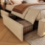 Dieses Polsterbett mit einer Liegefläche von 140x200 cm vereint nostalgischen Charme und moderne Funktionalität. Der samtbezogene Bezug in Beige und das handverzierte Kopfteil mit Nieten sorgen für eine elegante Ausstrahlung. Mit integrierter LED-Beleuchtung, USB- und Type-C-Anschlüssen sowie vier praktischen Schubladen bietet es hohen Schlafkomfort und viel Stauraum. Das stabile Gestell aus Metall und Holz gewährleistet eine hohe Tragfähigkeit von bis zu 181 kg.