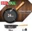 Die Ø24 cm Gusseisenpfanne ist 47 mm hoch und ideal für Induktionsherde geeignet. Sie verfügt über einen praktischen Holzgriff und einen Glasdeckel, der beim Kochen vor Fettspritzern schützt. Vor der ersten Nutzung muss die Pfanne eingebrannt werden, was zu starkem Rauch führen kann. Die raue Oberfläche sorgt für eine optimale Hitzeverteilung, während die Pfanne nicht spülmaschinengeeignet ist und nicht für die langfristige Aufbewahrung von Speisen verwendet werden sollte.