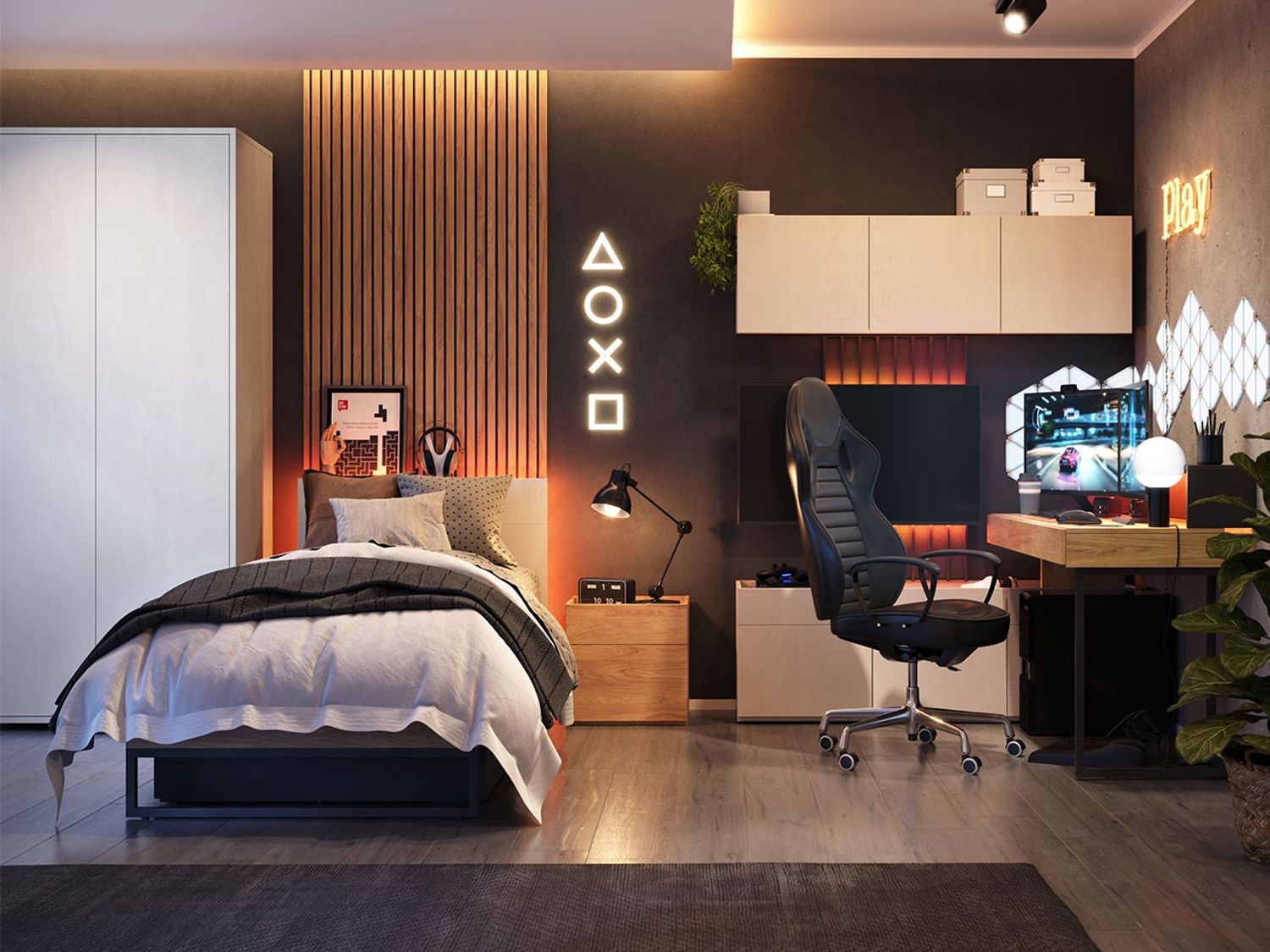 Das Jugendzimmer-Set Teen Flex III bietet eine umfassende Einrichtungslösung für Ihr Jugendzimmer. Es besteht aus einem Kleiderschrank, einem Schreibtisch mit Aufsatz, einer Kommode, einem Hängeschrank, zwei Wandpaneelen, einem Jugendbett und einem Nachttisch. Alle Möbel sind aus robusten Laminatplatten gefertigt und bieten durchdachte Funktionen wie ein grifflose Öffnungssystem und LED-Beleuchtung.