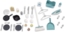 Auch im Waschbereich bleiben für kleine Haushaltshelfer keine Wünsche offen: die Waschmaschine ist mit einer zu öffnenden Bullaugentür und einem zweigeteilten Waschmittelfach ausgestattet. Sie lässt sich über einen Knopf mit Krick-Krack-Funktion bedienen. Weiterhin gibt es einen Wäscheständer, ein Bügelbrett mit mechanischem Bügeleisen und einen kleinen Wäschekorb mit zwei Griffen, der sich unterhalb des Bügelbretts verstauen lässt. Das umfangreiche Küchen- und Haushaltszubehör umfasst insgesamt 36 Zubehörteile: Bratpfanne, Topf mit Deckel, drei Küchenhelfer, zwei Tassen, zwei Gläser, zwei Teller, je zwei Mal Besteck, drei Pads für die Kaffeemaschine, Salz- und Pfefferstreuer mit Krick-Krack-Funktion sowie Spiellebensmittel-Leerverpackungen. Dazu kommen Besen und Kehrschaufel, zwei Kleiderbügel, vier Wäscheklammern und ein Bügeleisen mit mechanischer Funktion.