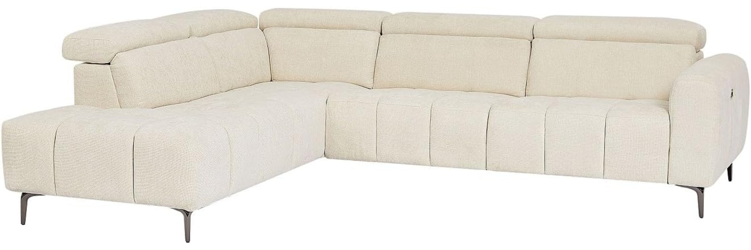 Das CALDORIA Ecksofa in Beige vereint Wohlbefinden und Innovation. Mit seinem elektrischen Mechanismus lässt sich die Sitzfläche bis zu 180° neigen, ohne dass das Sofa von der Wand abgerückt werden muss – ideal für kleine Räume. Die verstellbaren und abnehmbaren Kopfstützen bieten individuellen Komfort, während der integrierte USB-A-Anschluss das Aufladen Ihrer Geräte in Reichweite ermöglicht.