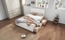 Praktisches Bett mit Stauraum in Weiß und Light Oak. Die stabile Massivholz-Konstruktion bietet eine Liegefläche von 140x200 cm und zwei geräumige Schubladen für flexiblen Stauraum. Das dezente Kopf- und Fußteil sorgt für eine harmonische Atmosphäre, während die vertiefte Matratzenauflage ein Verrutschen der Matratze verhindert. Der robuste Lattenrost garantiert gleichmäßige Unterstützung und hohen Liegekomfort.
