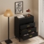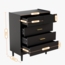 Die obere Schubladenreihe besteht aus zwei kleinen, grifflosen Schubladen mit eleganter Wellenfront. Darunter befinden sich drei große Schubladen mit hochwertigen, mattschwarzen Metallgriffen – ideal zum Verstauen von Haushaltsutensilien, Deko oder persönlichen Dingen.