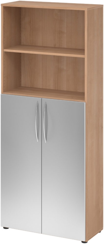 Die bümö Basic Aktenschrank-Regal Kombination bietet mit einer Breite von 80 cm und einer Höhe von 188 cm ausreichend Platz für Aktenordner und Materialien. Der Schrank ist aus melaminharzbeschichteter Spanplatte gefertigt und verfügt über vier höhenverstellbare Einlegeböden, die eine Tragkraft von bis zu 25 kg pro Boden bieten. Mit hochwertigen Ganzmetallscharnieren ausgestattet, ermöglicht er einen 110° Öffnungswinkel. Der Schrank ist ideal für den professionellen Einsatz und sorgt für einen kippelfreien Stand.