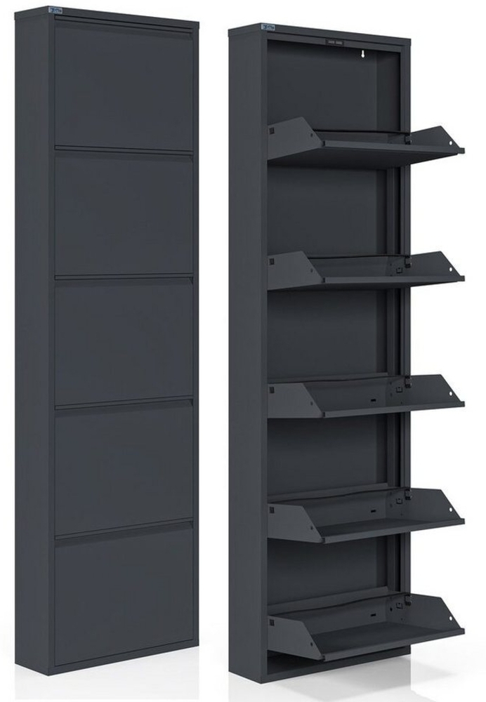 Der Kaufexpress Schuhschrank aus pulverbeschichtetem Metall vereint modernes Design mit Funktionalität. Mit einer Tiefe von nur 15 cm ist er ideal für schmale Flure oder Nischen geeignet. Je nach Ausführung bietet er Platz für 4 bis 15 Paar Schuhe in 2 bis 5 Klappen. Der Schrank wird fertig montiert geliefert und kann bei Bedarf an der Wand montiert werden.