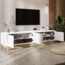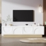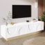 Moderner weißer TV-Schrank mit Holzmaserung, der ästhetisches Design und praktische Funktionalität vereint. Mit einem minimalistischen Kurvendesign und ausreichend Stauraum hinter vier Türen, bietet er Platz für Elektronik und Kabelmanagement. Die sanft geschwungenen Halbkreise auf den Türen verleihen Ihrem Wohnzimmer Lebendigkeit. Ideal für modernes Wohnen, bringt dieser Schrank Stil und Ordnung in Ihr Zuhause.
