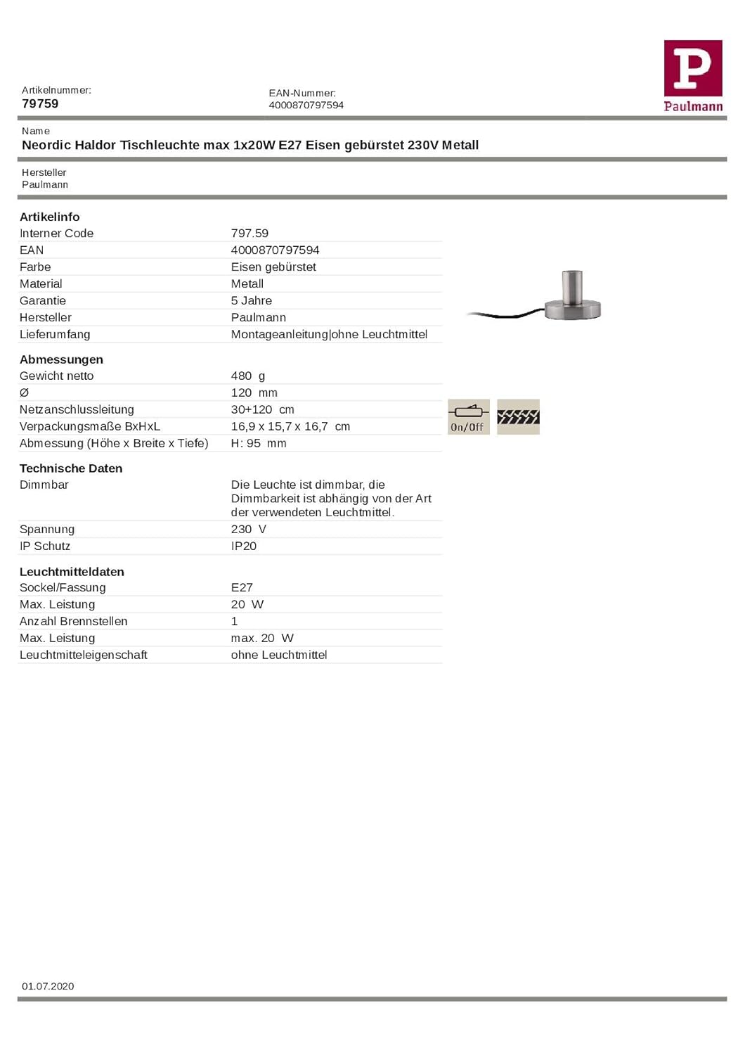 Paulmann Neordic Tischleuchte Haldor E27 max. 20W Eisen gebürstet Metall #79759 Bild 1