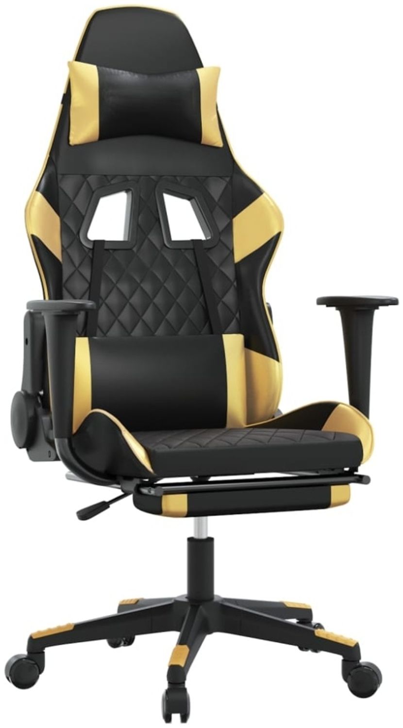 Genießen Sie eine komfortable Sitzposition mit dem Gaming-Stuhl in Schwarz und Gold aus hochwertigem Kunstleder. Die Massagefunktion im Taillenbereich bekämpft Müdigkeit, während die verstellbare Rückenlehne und Höhe individuellen Komfort bieten. Mit 360-Grad-Drehung und Rollen für Bewegungsfreiheit. Das robuste Metall- und Sperrholzgestell sorgt für Stabilität.