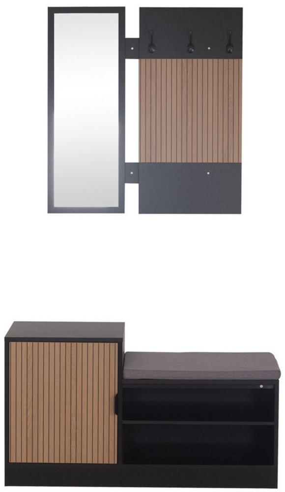 Praktisches Garderobenset bestehend aus einem Garderobenpaneel mit Spiegel und einer Schuhbank mit Sitzpolster. Das Garderobenpaneel (75,5 x 80 x 2,7 cm) bietet 3 Haken und ist bis 15 kg belastbar. Die Schuhbank (100 x 55,2 x 39,5 cm) hat 2 offene Regalfächer und 2 Fächer hinter der Tür, belastbar bis 100 kg. Der große Spiegel (25x75 cm) sorgt für ein helleres Raumgefühl und ermöglicht den letzten Check vor dem Verlassen des Hauses.