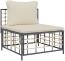 Das Garten-Mittelsofa mit beige Kissen aus Poly Rattan vereint elegantes Design mit hohem Komfort. Das wetterfeste PE-Rattan-Material ist langlebig und pflegeleicht, während der pulverbeschichtete Stahlrahmen Stabilität bietet. Die bequeme Rückenlehne und die dick gepolsterten Kissen sorgen für ein angenehmes Sitzgefühl. Mit einem modularen Design lässt sich das Sofa flexibel umstellen und kombinieren.