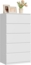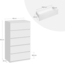 Die Woltu Kommode bietet mit ihren 5 Schubladen viel Stauraum und überzeugt durch ihr modernes, minimalistisches Design in Weiß. Mit den kompakten Abmessungen von 60 x 110 x 37 cm ist sie ideal für Räume mit begrenztem Platzangebot. Hergestellt aus robuster Spanplatte der Klasse E1 mit Melaminfolie, ist die Kommode kratzfest und leicht zu reinigen. Die Kippsicherung und Metallschienen sorgen für Stabilität und ein sanftes Öffnen der Schubladen.