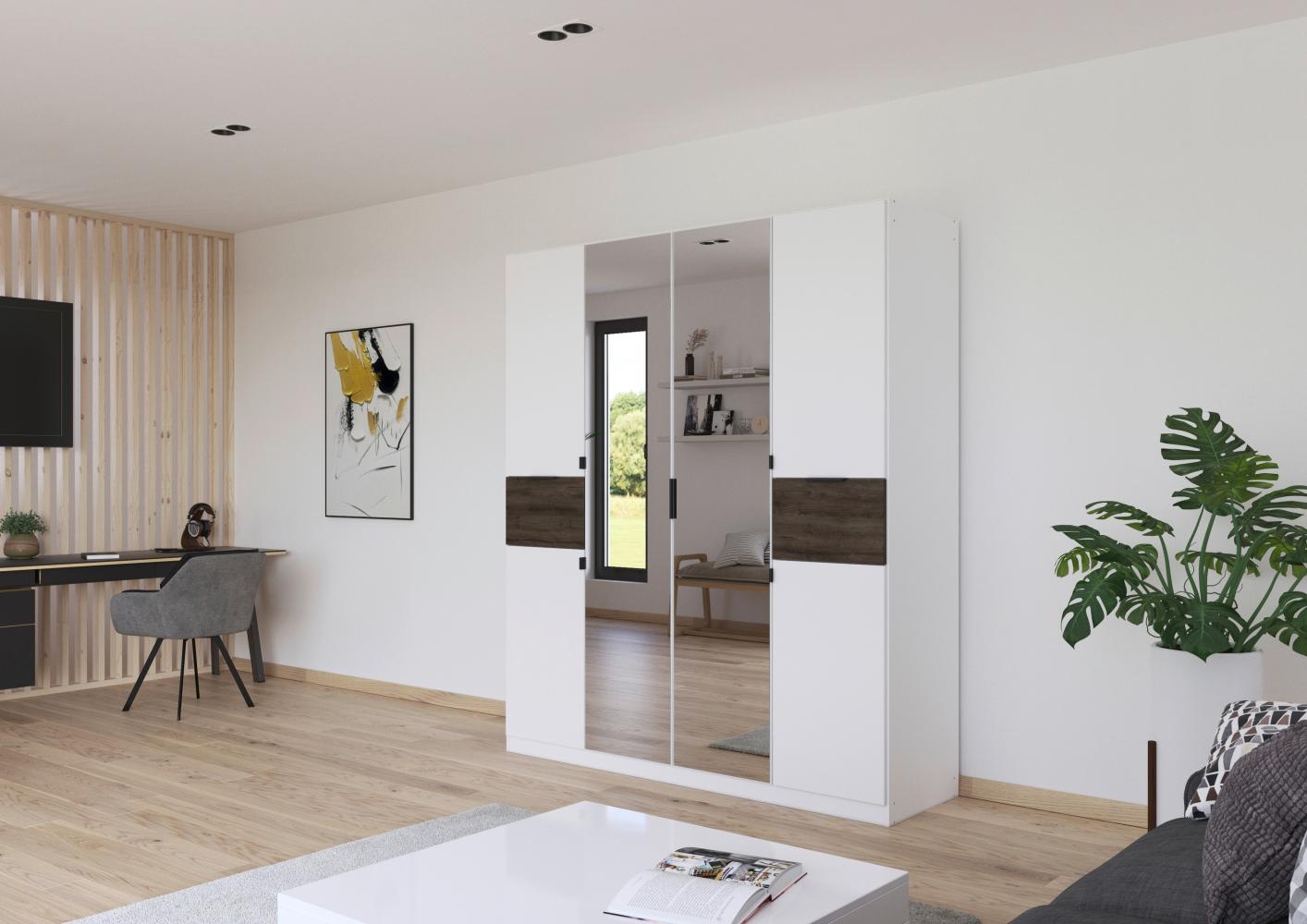 Der Rauch Kleiderschrank TICAO ist ein eleganter und funktionaler 6-türiger Drehtürenschrank in Alpinweiß und Atlantik Oak dunkel. Mit zwei Spiegeltüren und zwei Schubkästen bietet er nicht nur ausreichend Stauraum, sondern auch eine praktische Lösung für Ihr Schlafzimmer. Die Abmessungen betragen 181 cm in der Breite, 210 cm in der Höhe und 54 cm in der Tiefe. Dank der höhenverstellbaren Fachböden und Kleiderstangen können Sie Ihre Kleidung optimal organisieren.