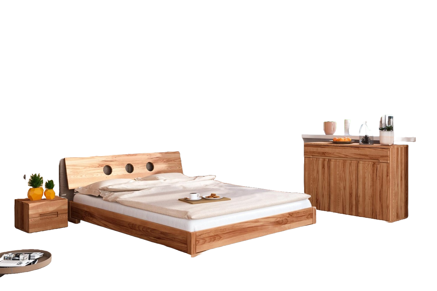 Bett Bento 13 aus Kernbuche massiv 120x200 cm mit Holzkopfteil und Holzbeinen