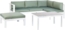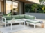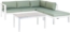 Modernes und praktisches Lounge Set MESSINA aus witterungsbeständigem, pulverbeschichtetem Aluminium in Weiß und grünen, abziehbaren Kissen. Das Set umfasst ein L-förmiges Ecksofa, eine Ottomane und einen Couchtisch mit robuster Sicherheitsglasplatte in heller Stein-Optik. Die Elemente sind flexibel platzierbar und bieten hohen Komfort. Ideal für entspannte Stunden im Freien.