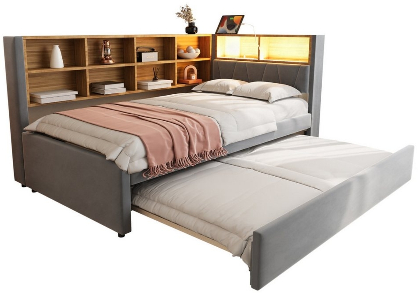 Dieses multifunktionale Schlafsofa (90 x 200 cm) ist die perfekte Lösung für kleinere Räume und Gästezimmer. Es bietet ein bequemes Einzelbett sowie ein praktisches Ausziehbett (90 x 190 cm) für bis zu zwei Personen. Mit integrierten USB-Steckdosen und geräumigem Stauraum für Kissen und Decken vereint es Komfort und Funktionalität. Der stabile Massivholzrahmen sorgt für Langlebigkeit und ein elegantes Design.