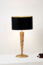 Ausladend umhüllt der schwarze Schirm den schlanken Fuß der Tischlampe.