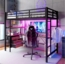 Hochbett HAUSS SPOLE 90x200 cm in Schwarz bietet eine stilvolle und funktionale Lösung für Ihr Zuhause. Mit einem stabilen Eisenrahmen und robusten MDF-Platten ist es langlebig und sicher. Die integrierte Lichtleiste sorgt für eine gemütliche Atmosphäre, während der multifunktionale Schreibtisch und die praktischen USB-Steckdosen das Arbeiten und Lernen erleichtern. Das sichere Geländer und die Treppe garantieren einen einfachen Zugang, besonders für Kinder.