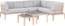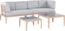 Modulares Ecksofa Lounge Set RIMA III in Grau. Dieses hochwertige Aluminium Gartenlounge Set bietet Platz für bis zu 6 Personen und überzeugt durch seine moderne, zeitlose Optik in heller Holzfarbe mit grauen Auflagen. Die beiden Tische bieten ausreichend Platz für Snacks und Getränke. Ideal für entspannte Stunden im Freien.
