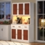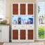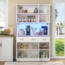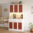 Der OKWISH Buffetschrank kombiniert großzügigen Stauraum mit modernem Landhausstil. Mit den Maßen 105 x 43 x 182 cm bietet er oben Türen mit verstellbaren Einlegeböden, ein offenes Fach mit LED-Beleuchtung in der Mitte und darunter Schubladen sowie Schrankfächer. Die weißen Fronten mit Stoffeinsätzen und Massivholzgriffen verleihen eine elegante Optik. Integrierte Steckdosen mit USB-Anschlüssen ermöglichen den direkten Betrieb von Geräten. Höhenverstellbare Böden und eine Anti-Kipp-Vorrichtung sorgen für Stabilität und Sicherheit.