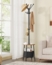 Der freistehende Garderobenständer in Vintagebraun-Schwarz bietet eine multifunktionale Aufbewahrungslösung mit 12 Hängepunkten, 1 Regal und 1 Aufbewahrungskorb. Mit einer Höhe von 182 cm und einer kompakten Basis von 30x30 cm fügt er sich ideal in Eingangsbereiche oder Schlafzimmer ein. Das stilvolle Design kombiniert Holzspanplatte und Stahl, während die verstellbaren Füße für Standsicherheit sorgen.