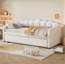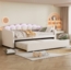 Das STILVORA Polsterbett ist ein elegantes Tagesbett mit einer ausziehbaren Funktion, ideal für Gäste. Mit den Abmessungen von 213 x 99 x 87 cm und einer Liegefläche von 90x200 cm bietet es ausreichend Platz. Das Bett ist aus hochwertigem Samt und MDF gefertigt und in der Farbe Beige erhältlich. Es hat eine Gewichtskapazität von 150 kg und ist mit 12 Lattenrosten ausgestattet. Die Montage ist erforderlich und das Produkt wird in 2 Paketen geliefert.
