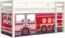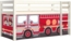 Das Hochbett aus der Serie Pino ist ein ideales Bett zum Schlafen, Spielen und Träumen. Die Liegefläche ist 90x200 cm. Es ist aus massiver Kiefer gefertigt und hat eine Pfostenstärke von 64x64 mm. Die Ausführung ist weiß lackiert. Es ist komplett ausgestattet, mit einem Rolllattenrost und der Leiter. Das Textilset im Design "FIRE RESCUE", bestehend aus dem Vorhang mit der tollen Darstellung eines Feuerwehrautos, gehört ebenfalls zum Lieferumfang. Die Textilien sind 100% Polyester, bei 30° waschbar. Die phantasievolle Gestaltung bringt viel Spaß beim Spielen, es ist ein Abenteuerspielplatz für jedes Kinderzimmer. Die Leiter (ca. 35 cm breit) ist links oder rechts montierbar. Der umlaufende Absturzschutz, die breiten Trittstufen zum sicheren Hinauf- und Hinabsteigen, sowie die hochwertige Verarbeitung und gute Stabilität, zeichnen diesen Artikel aus. Die Höhe von der Oberkante der Bettseite bis Oberkante Absturzschutz ist ca. 36 cm, bei einer max. Matratzenhöhe von ca. 20 cm. Der Raum unter der Liegefläche lässt sich prima zum Spielen nutzen, oder kann als Stauraum genutzt werden. Die Höhe vom Boden bis Unterkante der Bettseite beträgt ca. 72 cm. Der Abstand zwischen Leiter und Bettpfosten ist ca. 157 cm. Als Stellfläche im Raum benötigen Sie ca. B: 210 x T: 106 cm. Die Höhe ist ca. 114 cm. Für Kinder unter 6 Jahren ist das Bett nicht geeignet. Die Dekoration und die Matratze gehören nicht zum Lieferumfang. Der Artikel ist ist zerlegt mit Aufbauanleitung zur einfachen Selbstmontage. FSC®-zertifiziert und nach EN 747-2:2012+A1(2015) gebaut.