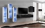 3x Hängevitrine: PVC Teilglastür, beidseitig montierbar. Innen zwei Glasablagen. Tv-Tisch: eine PVC Hochglanzklappe, innen drei Fächer. Wandkästchen: PVC Hochglanz Front, beidseitig montierbar. Innen ein normaler Boden. Fronten auf Knopfdruck geöffnet.