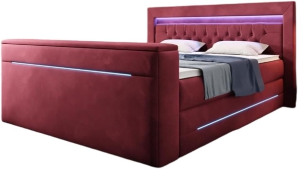 Das Boxspringbett Pluto mit TV Lift, RGB und Stauraum in der Größe 180 x 200 cm in Rot H2 vereint Komfort und Funktionalität in einem modernen Design. Der elegante Samtbezug sorgt für eine luxuriöse Atmosphäre in Ihrem Schlafzimmer. Der integrierte TV Lift ermöglicht es Ihnen, Ihren Flachbildfernseher bequem aus dem Fußteil des Bettes zu heben. Zudem bietet der praktische Stauraum unter der Matratze Platz für Bettwäsche, Kissen und Decken. Die RGB-Beleuchtung mit 16 Farben schafft die perfekte Stimmung für jede Gelegenheit.