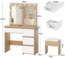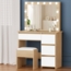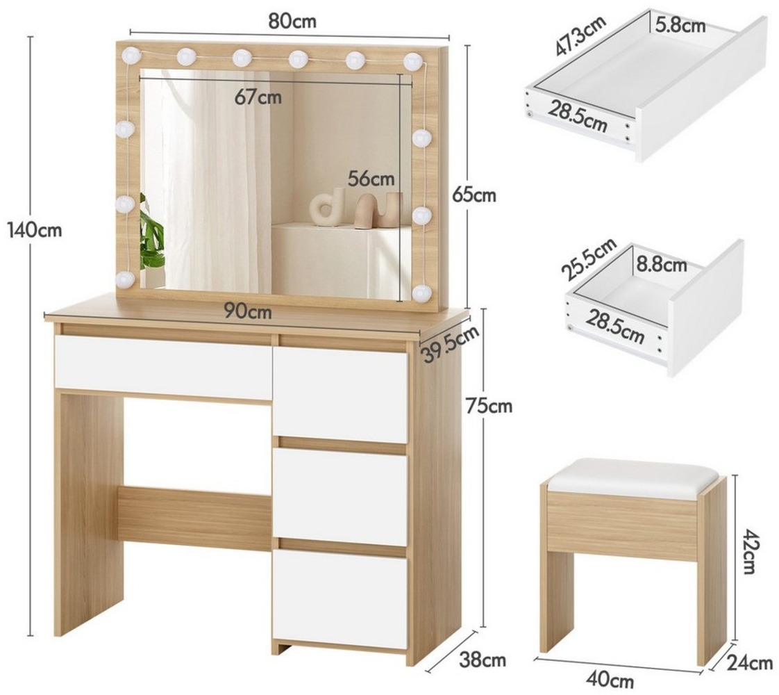 Das Alfordson Schminktisch-Set bietet Ihnen eine stilvolle und praktische Lösung für Ihr Schlafzimmer. Mit einer großzügigen Tischplatte von 90 cm und vier Schubladen sorgt es für ausreichend Stauraum. Die integrierte LED-Beleuchtung mit 12 Leuchtmitteln in drei Lichtfarben ermöglicht eine optimale Ausleuchtung. Der passende gepolsterte Hocker mit Stauraum ergänzt das Set perfekt.
