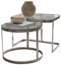 Elegantes Couchtisch-Set bestehend aus zwei Tischen in verschiedenen Formen. Die Kombination aus glänzendem Eisen und klarem Ornamentglas sorgt für eine stilvolle Ausstrahlung. Jede Tischplatte ist ein Unikat mit einzigartigen Mustern. Der runde Tisch lässt sich mühelos unter den eckigen Tisch schieben, was Flexibilität und Platzersparnis in modernen Wohnräumen bietet.