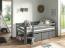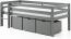 Das Kojen-Spielbett mit Liegefläche 90x200 cm ist ein multifunktionales Bett für Kinder. Es verfügt über 3 geräumige Schubkästen, die für Ordnung im Kinderzimmer sorgen. Das Bett ist aus massiver Kiefer gefertigt und in grau lackiert. Es hat eine niedrige Liegehöhe und eignet sich daher gut für Räume mit Dachschrägen. Das Bett wird inklusive Leiter und Rolllattenrost geliefert. Die Schubkästen sind aus hochwertigem MDF und ebenfalls grau lackiert. Die Montage ist einfach und das Bett ist stabil und sicher. Bitte beachten Sie, dass das Bett für Kinder unter 6 Jahren nicht geeignet ist. Der Lieferumfang umfasst das Bett, die Leiter, den Rolllattenrost und die 3 Schubkästen. Dekoration, Regal und Matratze sind nicht enthalten.