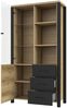 Die Vitrine Olin Standvitrine in eichefarben Grand natur/schwarz supermatt besticht durch ihr attraktives Industrial Design. Mit 2 Türen, 3 Schubladen, 3 offenen Fächern und Glaseinlegeböden bietet sie viel Stauraum. Die Vitrine aus Spanplatte und Glas/MDF-Rahmen hat die Maße 101 x 43 x 191 cm. Max. Belastbarkeit: Glaseinlegeböden 3 kg, Holzeinlegeböden 5 kg. Selbstmontage erforderlich.