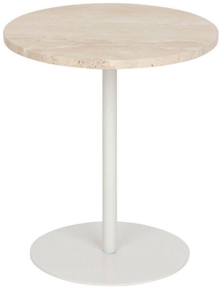 Runder Couchtisch aus Travertin mit elegantem Design und funktionalen Eigenschaften. Die Tischplatte aus strukturiertem Travertin ist mit einer Epoxidharz-Beschichtung versehen, die Schutz vor Flecken bietet und die Reinigung erleichtert. Die stabilen Eisenbeine garantieren Langlebigkeit, während die kompakten Maße von 40 cm Durchmesser und 45 cm Höhe den Tisch zur idealen Lösung für kleinere Räume machen.