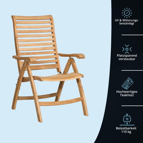 KHG Klappstuhl Garten aus Eukalyptusholz, Hochlehner mit Armlehnen aus massiven & rustikalen Echtholz, Gartenstuhl Holz Outdoor für Garten, Balkon & Terrasse, klappbar platzsparend wetterfest