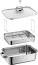 Dein neuer Aroma-Dampfgarer fasst 6,5 Liter und ist aus der Vitalis Serie von WMF. Dein gesunder Genuss pur im vitamin- und aromaschonendes Dampfgarsystem. Der Vitalis Aroma-Dampfgarer bringt jede Menge gesunde Abwechslung in die Küche: Er bewahrt den aromatischen Eigengeschmack sowie die Nährstoffe der Zutaten und sorgt so ganz einfach für köstliche, gesunde Ergebnisse. Fisch, Fleisch und Gemüse lassen sich mit dem integrierten Thermometer auf den Punkt genau vitaminschonend garen. Der Glasdeckel ermöglicht eine optimale Garkontrolle, während die Zutaten herrlich saftig bleiben, ohne anzubrennen oder auszutrocknen. Der Trans Therm®-Allherdboden ermöglicht dabei perfektes Schmoren, Garen und Braten auf allen Herdarten, einschließlich Induktion. Was ist drin für dich? 1x Aroma Dampfgarer 1x Glasdeckel 1x Aroma Garblech / Zubehör Deine Vorteile beim WMF Vitalis Aroma Dampfgarar mit 6,5 Litern: Gesunder, vielseitiger Genuss Der luftdichte Silikonrand des Glasdeckels und das integrierte Thermometer sorgen für absolut präzises und schonendes Dämpfen sowie vielseitiges Garen für gesunde, aromatische Ergebnisse. Rechteckiges Format mit großem Fassungsvermögen Die rechteckige Konstruktion bietet die optimale Größe und das perfekte Volumen, um alle Lieblingszutaten platzsparend zu dämpfen. Der kompakte WMF Vitalis Aroma-Dampfgarer 6,5 l passt mühelos auf jeden Herd und in jeden Schrank zu passen. Vielseitige, einfache Bedienung Absolut vielseitige, gesunde Gerichte dank des 2-teiligen Gareinsatzes mit abnehmbarem Rand. Diese multifunktionale Kochgeschirr lässt auf dem Herd und im Backofen bis zu 250°C (ohne Deckel) und 180°C (mit Deckel) verwenden. Wärmereduzierende Griffe Die Hohlgriffe reduzieren die Wärmeübertragung vom Topf auf die Griffe, wenn der Dampfgarer auf dem Herd verwendet wird. Für ein sicheres und komfortables Handling.