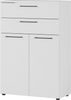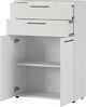 Front: Spanplatte, melaminharzbeschichtet · Korpus: Spanplatte, melaminharzbeschichtet · Oberboden: Spanplatte, melaminharzbeschichtet · mit 2 Türen und Türdämpfer · mit 2 Schubkästen · max Belastbarkeit pro Schubkasten: 10kg · mit 1 Einlegenboden · max. Belastbarkeit pro Boden 10kg · Anzahl Füße: 5 Stück · Anzahl Griffe: 4 Stück · Griff grau aus Metall · Made in Germany · Aktenschrank mit zwei Schubladen (jeweils belastbar bis zu 10 kg) und zwei Türen, dahinter ein verstellbarer Einlegeboden (bis zu 10 kg belastbar), Oberboden bis zu 10 kg und Unterboden mit bis zu 30 kg belastbar, vier Bügelgriffe aus Metall in Graphit, fünf schwarze Möbelgleiter, Melaminharzbeschichtung, ABS-Kanten, Türdämpfung, Selbsteinzug der Schubladen, Made in Germany.