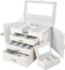 Yorbay Schmuckkasten Schmuckkoffer mit 4 Ebenen/2 Seitenfächern, Cremeweiß mit Holzmaserung (Abschließbar, Mit herausnehmbarer Mini-Box, Mit Spiegel), Schmuckkästchen für Halsketten/Uhren/Ringe/Armbänder/Ohrringe/Brille