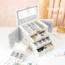 Praktischer Schmuckkasten in Cremeweiß mit Holzmaserung, ausgestattet mit 4 Ebenen und 2 Seitenfächern. Der Koffer bietet ausreichend Stauraum für Ringe, Ohrringe, Halsketten und Uhren. Mit einem abschließbaren Deckel, einem großen Kosmetikspiegel und einer herausnehmbaren Mini-Box ist er ideal für Zuhause und auf Reisen. Die hochwertige Verarbeitung aus Kunstleder und MDF sorgt für Stabilität und Langlebigkeit.