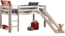 Dieses Hochbett mit Rutsche läd zum Spielen und Schlafen ein. Es ist aus massiver Kiefer gefertigt und in der Ausführung weiß lackiert. Die Rutsche bringt viel Spaß beim Spielen und die Leiter und Rutsche ist links oder rechts montierbar. Das Textilset in dem Design "Birdy" mit seiner verspielt romatischen Optik, besteht aus dem Vorhang, gehört mit zum Lieferumfang. Die Grundfarbe ist ein heller Beigefarbton, auf dem sich das florale Muster mit Schmetterlingen und Ranken farblich toll absetzt. Der vordere Vorhang hat einen Durchlass, der hochgerollt werden kann. Die Textilien sind 100% Baumwolle, bei 30° waschbar. Der Raum unter der Liegefläche lässt sich prima zum spielen nutzen, oder kann als Stauraum genutzt werden. Die Höhe vom Boden bis Unterkante der Bettseite beträgt ca. 70 cm. Ein Rolllattenrost gehört zum Lieferumfang. Die Leiter ist links oder rechts montierbar. Der umlaufende Absturzschutz, die breiten Trittstufen zum sicheren Hinauf- und Hinabsteigen, sowie die hochwertige Verarbeitung und gute Stabilität, zeichnen diesen Artikel aus. Pfostenstärke ca. 6,5x6,5 cm. Die Liegefläche ist 90x200 cm. Benötigte Stellfläche ca. 210x218 cm. Höhe 114 cm. Der Artikel ist zerlegt mit Aufbauanleitung zur einfachen Selbstmontage. FSC®-zertifiziert und nach EN 747-2:2012+A1(2015) gebaut.